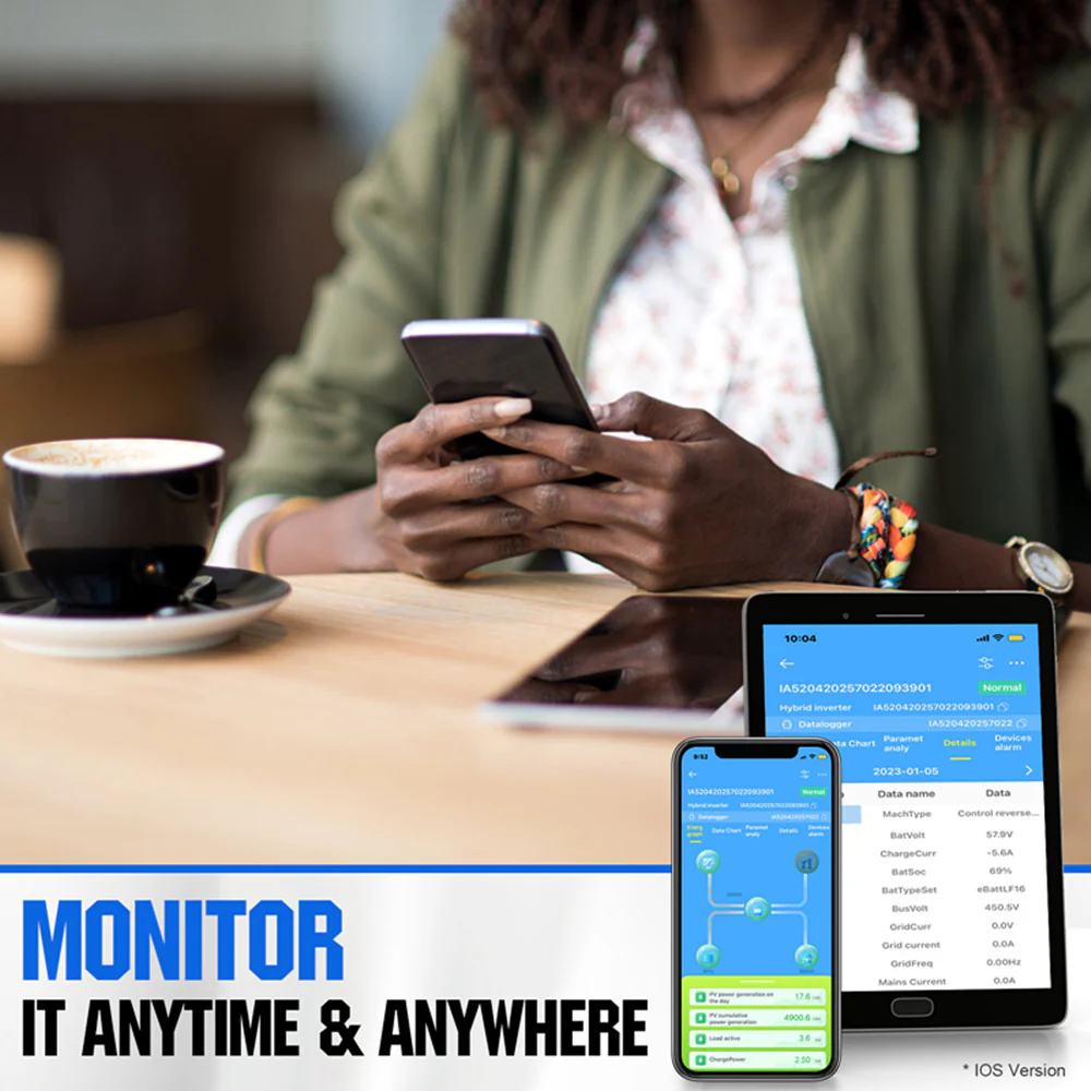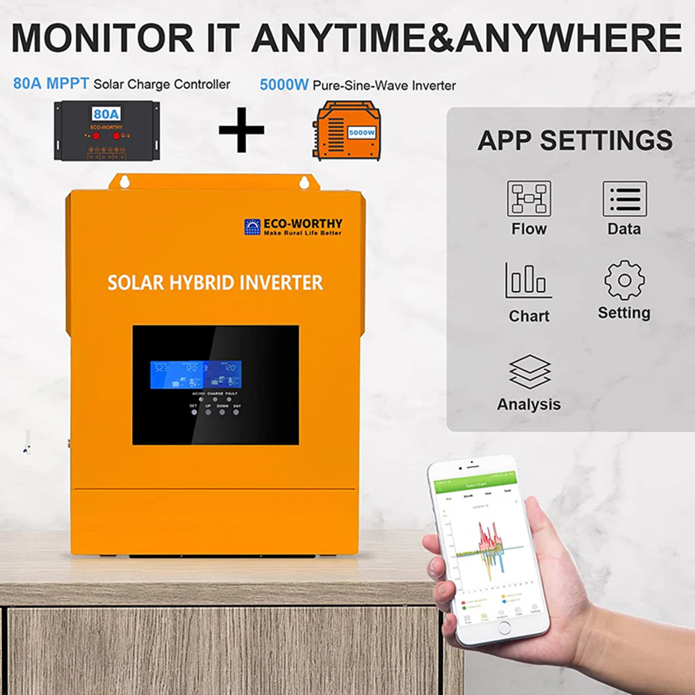 All in one inverter Integrated with 80A/48V MPPT solar charge controller, 5000W pure sine wave inverter in one compact unit to let you enjoy the stable power from the sun and the utility grid to keep you powered under any circumstances.